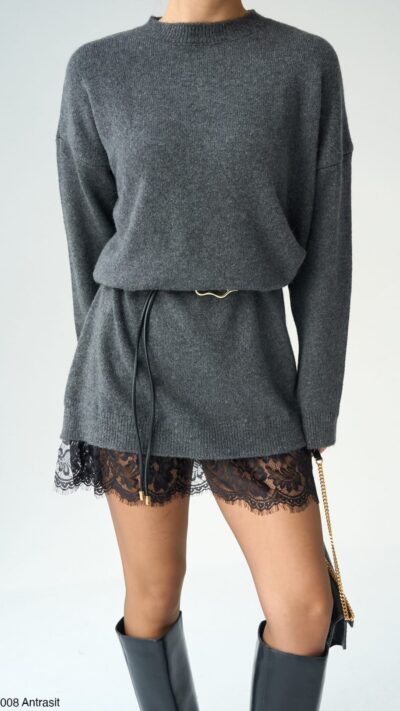 Charcoal Knit Dress With Lace Hem
