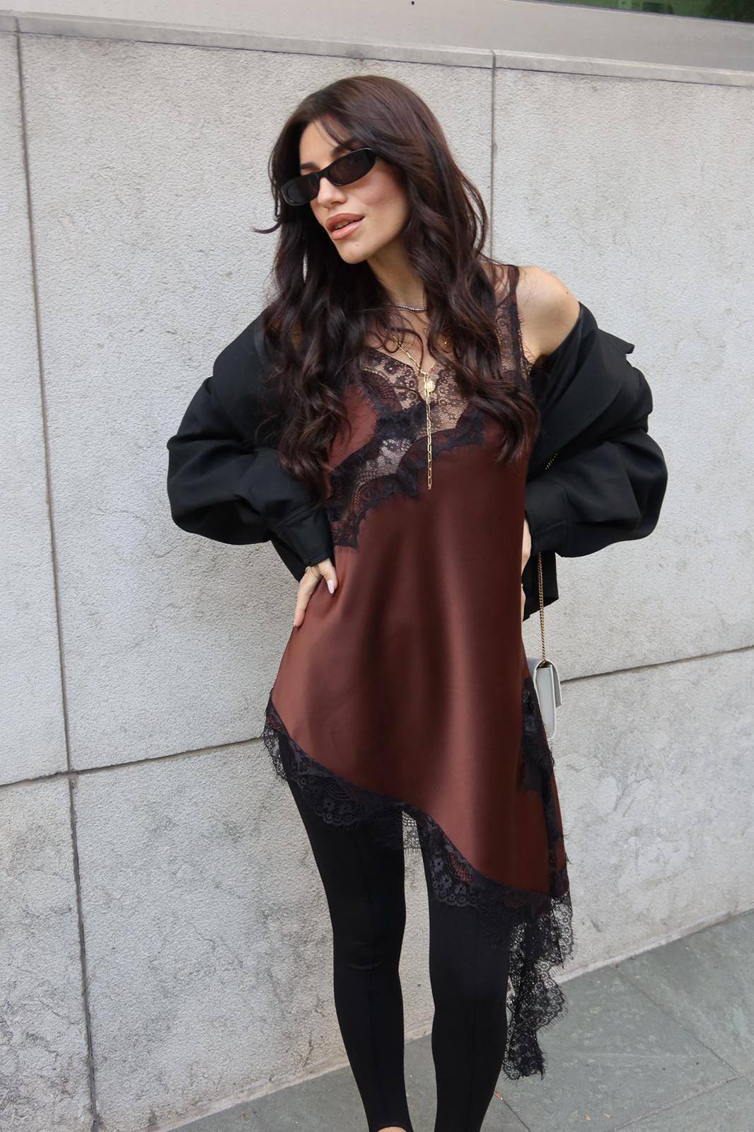 Brown Satin Lace Trim Slip