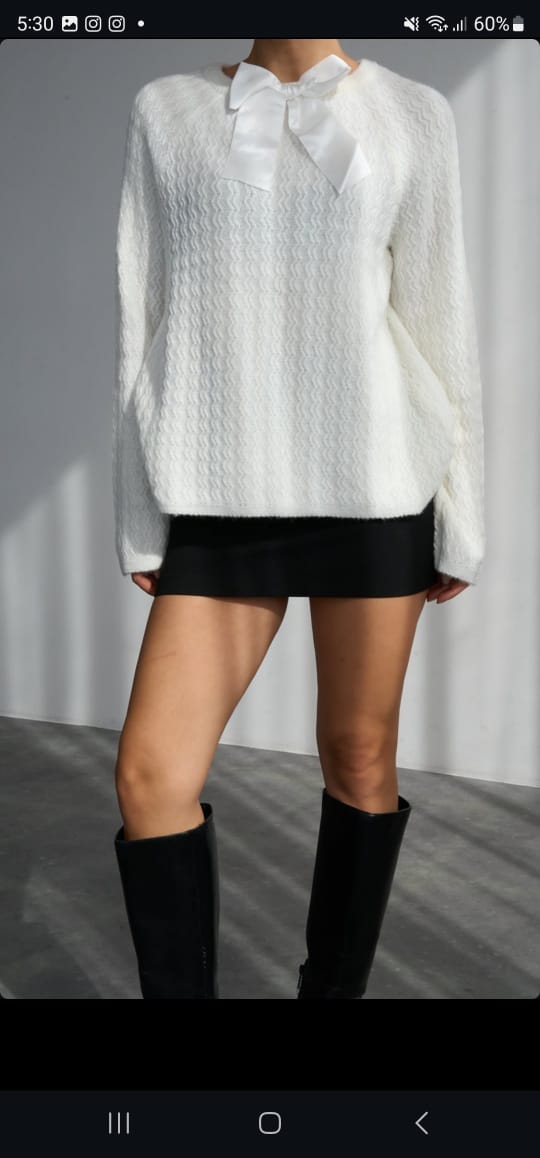 White knit sweater with a satin bow at the neckline