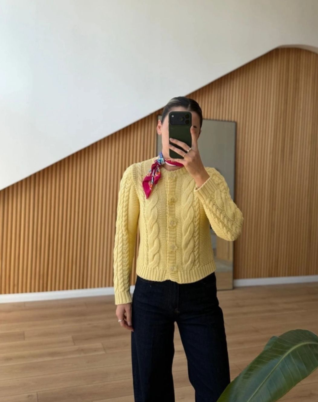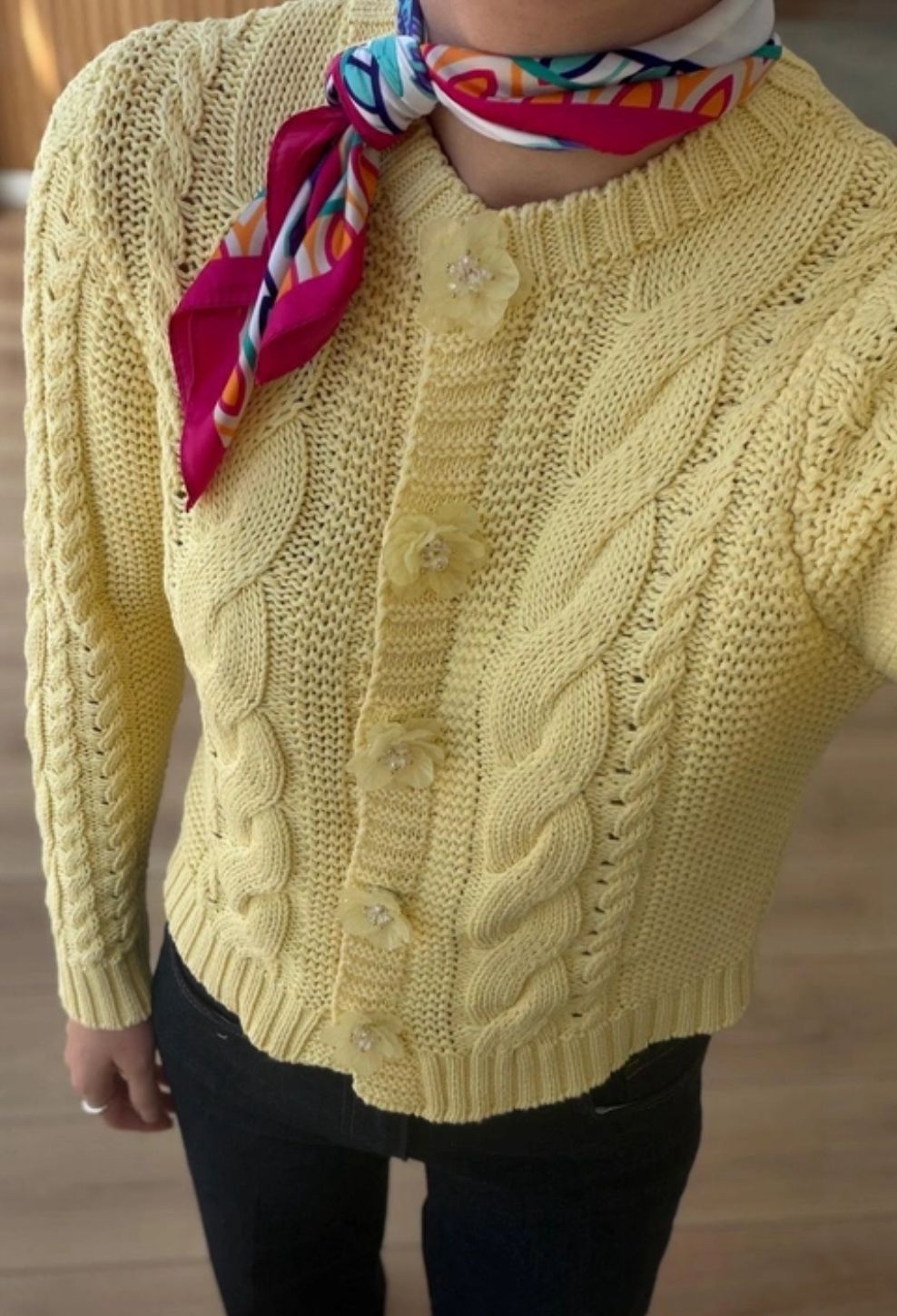 Home Cardigans Yellow cable knit cardigan with floral buttons
